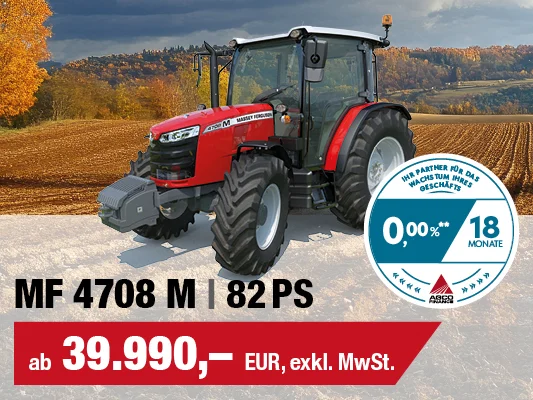 Der MF 4708 M ist ein moderner, leistungsstarker und einfach gehaltener Traktor fĂŒr schwerste Arbeiten. Der Traktor mit 82 PS ist mit dem 12 Ă 12 Gang Synchrongetriebe mit Wendeschaltung und einem 3,3 l AGCO Power Dreizylindermotor Stufe V ausgestattet.