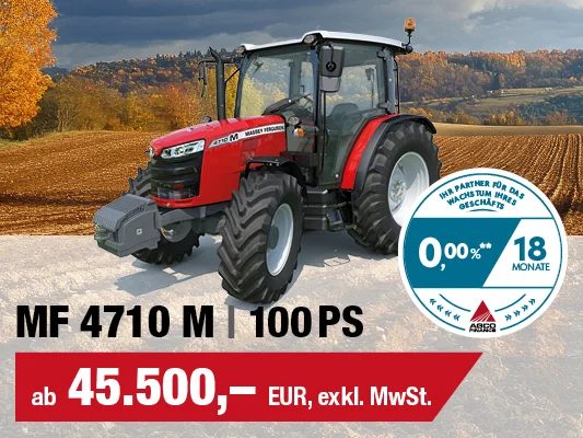 Der MF 4710 M ist ein moderner, leistungsstarker und einfach gehaltener Traktor fĂŒr schwerste Arbeiten. Der Traktor mit 100 PS ist mit dem 12 Ă 12 Gang Synchrongetriebe mit Wendeschaltung und einem 3,3 l AGCO Power Dreizylindermotor Stufe V ausgestattet.