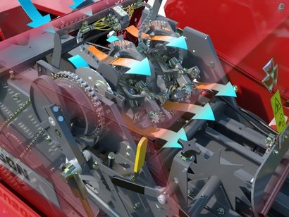 Die MF 1840 ist serienmĂ€Ăig mit einem elektrischen KnotergeblĂ€se ausgestattet, das gewĂ€hrleistet, dass die Knoter wĂ€hrend des Betriebs sauber und frei von Ablagerungen bleiben.