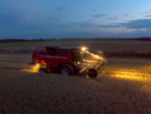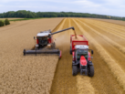 Der bis zu 6500 l fassende Korntank wird mit bis zu 85 l/s entleert. Dank der Obenentleerung können auch die höchsten AnhĂ€nger auf dem Feld oder auf der StraĂe beladen werden.