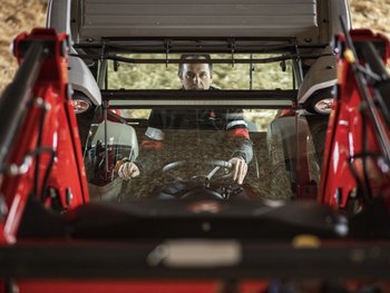 Fahrer schÀtzen das Visioline-Glasdach, weil es eine perfekte Sicht beim Stapeln von Ballen oder beim Beladen von AnhÀngern bietet. Das Dach besitzt einen Schutzaufbau gegen herabfallende GegenstÀnde (FOPS).